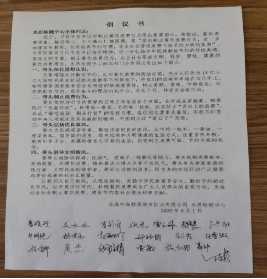 為深入貫徹落實習(xí)近平總書記的重要指示精神,示范帶動公司形成“厲行節(jié)約、反對浪費(fèi)”的良好風(fēng)尚。海勃灣城市供水公司水質(zhì)檢測中心發(fā)起了“厲行節(jié)儉,杜絕浪費(fèi)”倡議書。倡議書主要內(nèi)容是從現(xiàn)在開始,從生活習(xí)慣做起,在細(xì)微之中爭做勤儉節(jié)約的傳播者、踐行者和示范者,用實際行動展現(xiàn)出理性消費(fèi),節(jié)約勤儉的良好社會風(fēng)尚,共同為建設(shè)文明、和諧、環(huán)保的社會環(huán)境作出應(yīng)有的貢獻(xiàn)!