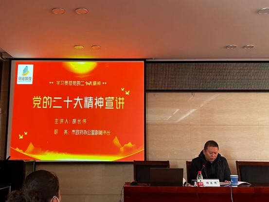 2023年1月18日,市政府辦公室副秘書長胡長偉到市城投集團公司開展學(xué)習(xí)宣傳貫徹黨的二十大精神宣講,市城投集團黨委書記郝關(guān)峰主持會議,集團公司領(lǐng)導(dǎo)班子成員,集團公司各部室正、副部長,機關(guān)黨支部全體黨員,各直屬黨組織書記及工作人員參加了本次宣講活動。