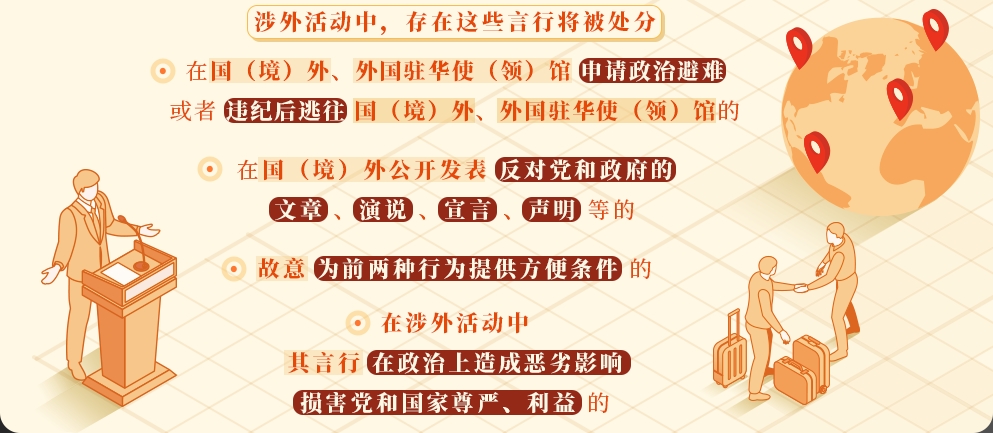 涉外活動關(guān)系黨和國家的尊嚴(yán)和榮譽,具有很強的政治性?!吨袊伯a(chǎn)黨紀(jì)律處分條例》第七十二條、七十三條對涉外活動中存在有政治問題的言行作了處分規(guī)定,主要有以下幾類:1.在國(境)外、外國駐華使(領(lǐng))館申請政治避難,或者違紀(jì)后逃往國(境)外、外國駐華使(領(lǐng))館的,給予開除黨籍處分。所謂“申請政治避難”,一般指黨員以所謂“政治原因”為借口,逃往國(境)外或外國駐華使(領(lǐng))館,申請取得居留權(quán)并居住在國(境)外或者外國駐華使(領(lǐng))館。“違紀(jì)后逃往國(境)外、外國駐華使(領(lǐng))館的”,一般指違紀(jì)黨員為逃避紀(jì)律處分,逃往國(境)外、外國駐華使(領(lǐng))館。無論是向外國申請政治避難,還是違紀(jì)后逃往國(境)外,都表明該黨員已徹底背叛黨的事業(yè),喪失了共產(chǎn)黨員條件,應(yīng)當(dāng)給予開除黨籍處分。2.在國(境)外公開發(fā)表反對黨和政府的文章、演說、宣言、聲明等的,給予開除黨籍處分。黨員在國(境)外公開發(fā)表反對黨和政府的言論,同樣表明其已徹底背叛了黨的事業(yè),喪失了共產(chǎn)主義信仰和共產(chǎn)黨員應(yīng)具備的條件,應(yīng)當(dāng)受到最嚴(yán)厲的紀(jì)律處分。3.故意為前兩種行為提供方便條件的,給予留黨察看或者開除黨籍處分?!疤峁┓奖銞l件”,主要指為申請政治避難、外逃或者在國(境)外公開發(fā)表反動言論等提供各種有利條件,如為其開具證明、代辦護照簽證、幫助購買車船機票、提供經(jīng)濟幫助、提供落腳點、提供發(fā)表反動言論的平臺,等等。4.在涉外活動中,其言行在政治上造成惡劣影響,損害黨和國家尊嚴(yán)、利益的,給予撤銷黨內(nèi)職務(wù)或者留黨察看處分;情節(jié)嚴(yán)重的,給予開除黨籍處分。此類違紀(jì)行為包括兩個條件:一是該行為發(fā)生在涉外活動中;二是在政治上造成惡劣影響,損害黨和國家尊嚴(yán)、利益。無論什么時候,黨員干部都要切實增強政治敏銳性,在涉外活動中以良好精神風(fēng)貌和舉止言行維護黨和國家形象,堅決防范有政治問題的言行。
