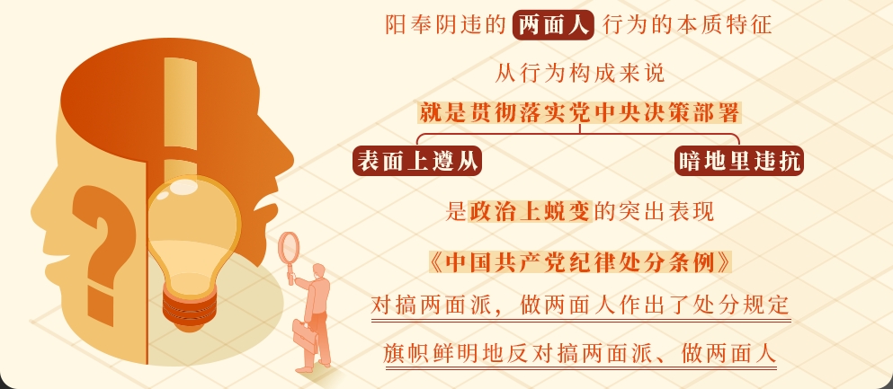 《中國共產(chǎn)黨紀(jì)律處分條例》規(guī)定,對(duì)黨不忠誠不老實(shí),表里不一,陽奉陰違,欺上瞞下,搞兩面派,做兩面人,在政治上造成不良影響的,給予警告或者嚴(yán)重警告處分;情節(jié)較重的,給予撤銷黨內(nèi)職務(wù)或者留黨察看處分;情節(jié)嚴(yán)重的,給予開除黨籍處分。我們黨始終旗幟鮮明地反對(duì)搞兩面派、做兩面人。黨章第三條將“對(duì)黨忠誠老實(shí),言行一致”,“反對(duì)陽奉陰違的兩面派行為和一切陰謀詭計(jì)”作為黨員必須履行的義務(wù),將“對(duì)黨忠誠”寫入入黨誓詞?!蛾P(guān)于新形勢下黨內(nèi)政治生活的若干準(zhǔn)則》規(guī)定,“黨的各級(jí)組織和全體黨員必須對(duì)黨忠誠老實(shí)、光明磊落,說老實(shí)話、辦老實(shí)事、做老實(shí)人”,“反對(duì)搞兩面派、做‘兩面人’”。大量案件表明,黨內(nèi)一些人在這方面問題突出,說一套、做一套,臺(tái)上一套、臺(tái)下一套,當(dāng)面一套、背后一套,隱藏很深,危害很大。陽奉陰違的兩面人行為的本質(zhì)特征,從行為構(gòu)成來說,就是貫徹落實(shí)黨中央決策部署表面上遵從,暗地里違抗,是政治上蛻變的突出表現(xiàn)。此次《條例》修訂,將2018年《條例》相關(guān)條款中的“情節(jié)較輕”修改為“在政治上造成不良影響”,更進(jìn)一步明確了陽奉陰違的兩面人行為必須具有政治危害。衡量是否屬于搞兩面派、做兩面人,根本標(biāo)準(zhǔn)就是政治標(biāo)準(zhǔn),就是對(duì)黨是否忠誠老實(shí),看表里行為是否體現(xiàn)突出的兩面性和政治危害性。搞兩面派,做兩面人的行為,違背黨員義務(wù),損害黨的團(tuán)結(jié)和統(tǒng)一,損害黨和人民利益,渙散黨的組織,透支黨的信譽(yù),損害黨的形象,危害很大。黨員、干部必須嚴(yán)格遵守黨章、準(zhǔn)則要求,對(duì)照《條例》規(guī)定,切實(shí)做到對(duì)黨組織忠誠老實(shí)、襟懷坦白、言行一致。