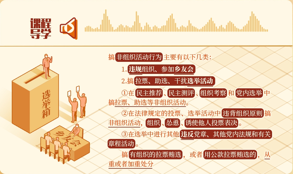 黨內(nèi)選舉是黨內(nèi)政治生活的重要組成部分。《關(guān)于新形勢(shì)下黨內(nèi)政治生活的若干準(zhǔn)則》規(guī)定,黨內(nèi)選舉必須體現(xiàn)選舉人意志,堅(jiān)決防止和查處拉票賄選等行為。在選舉活動(dòng)中搞非組織活動(dòng),干擾選舉人表達(dá)選舉意愿,侵犯其他被選舉人權(quán)益,侵蝕黨內(nèi)政治文化,在黨員群眾中造成不良影響,對(duì)這類違反組織紀(jì)律的行為必須予以堅(jiān)決懲治。