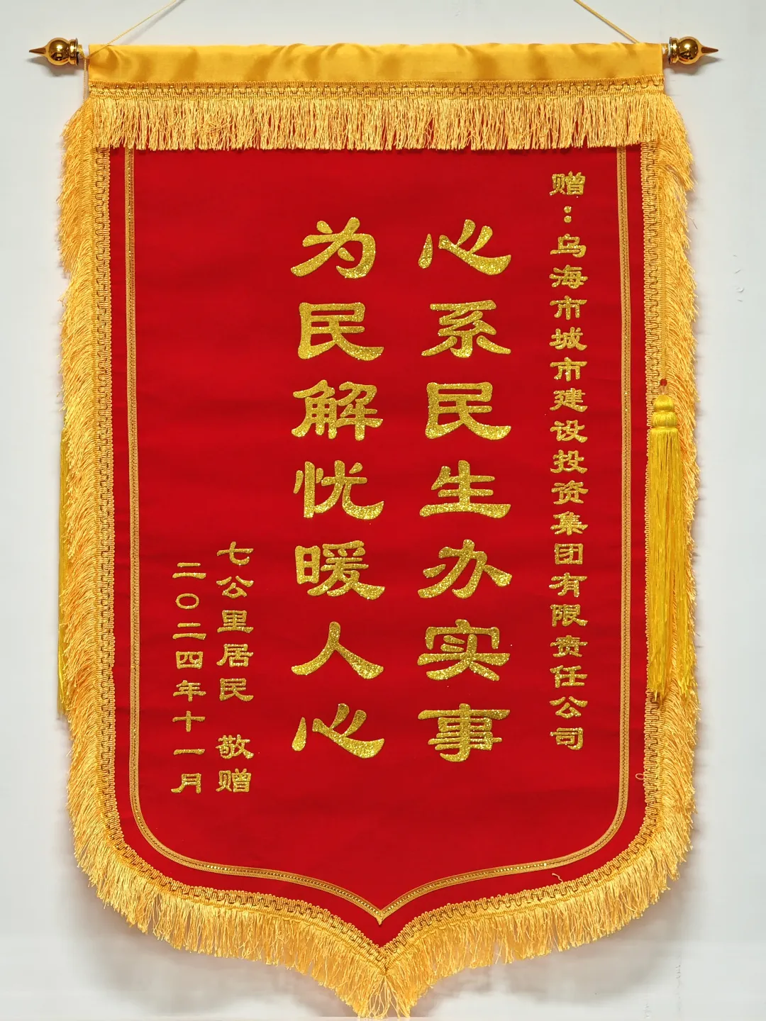 11月6日上午,烏海市城市建設投資集團有限責任公司收到海勃灣區(qū)三廠七公里處居民送來的錦旗,錦旗上的“心系民生辦實事 為民解憂暖人心”幾個大字熠熠生輝。