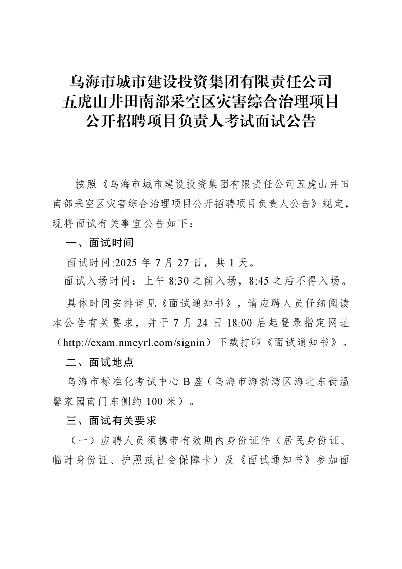 烏海市城市建設(shè)投資集團有限責(zé)任公司五虎山井田南部采空區(qū)災(zāi)害綜合治理項目公開招聘項目負(fù)責(zé)人考試面試公告